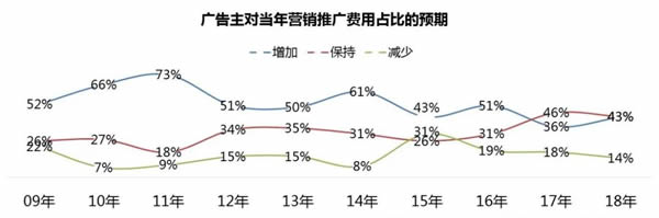 根據調查數據顯示,在過去這些年起起伏伏的趨勢中,去年和往年不太一樣,保持投入的廣告主的比例最高,達到46%,今年增加和持平的廣告主比例達到相對持平的狀態為43%,也就是希望增加投入以及希望減少投入的廣告主的比例基本上是一致的。