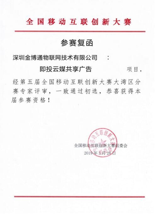 作為本次大會的協辦單位,即投云媒同時也是2019全國移動互聯創新大賽參賽單位,即投云媒不僅助力大會的成功召開,還為現場嘉賓帶去了共享廣告行業全新模式、領先技術解決傳統媒體的市場痛點方案。憑借科技和創新,即投云媒共享廣告平臺備受現場嘉賓和評委的青睞,通過分賽初選,獲得復賽資格。