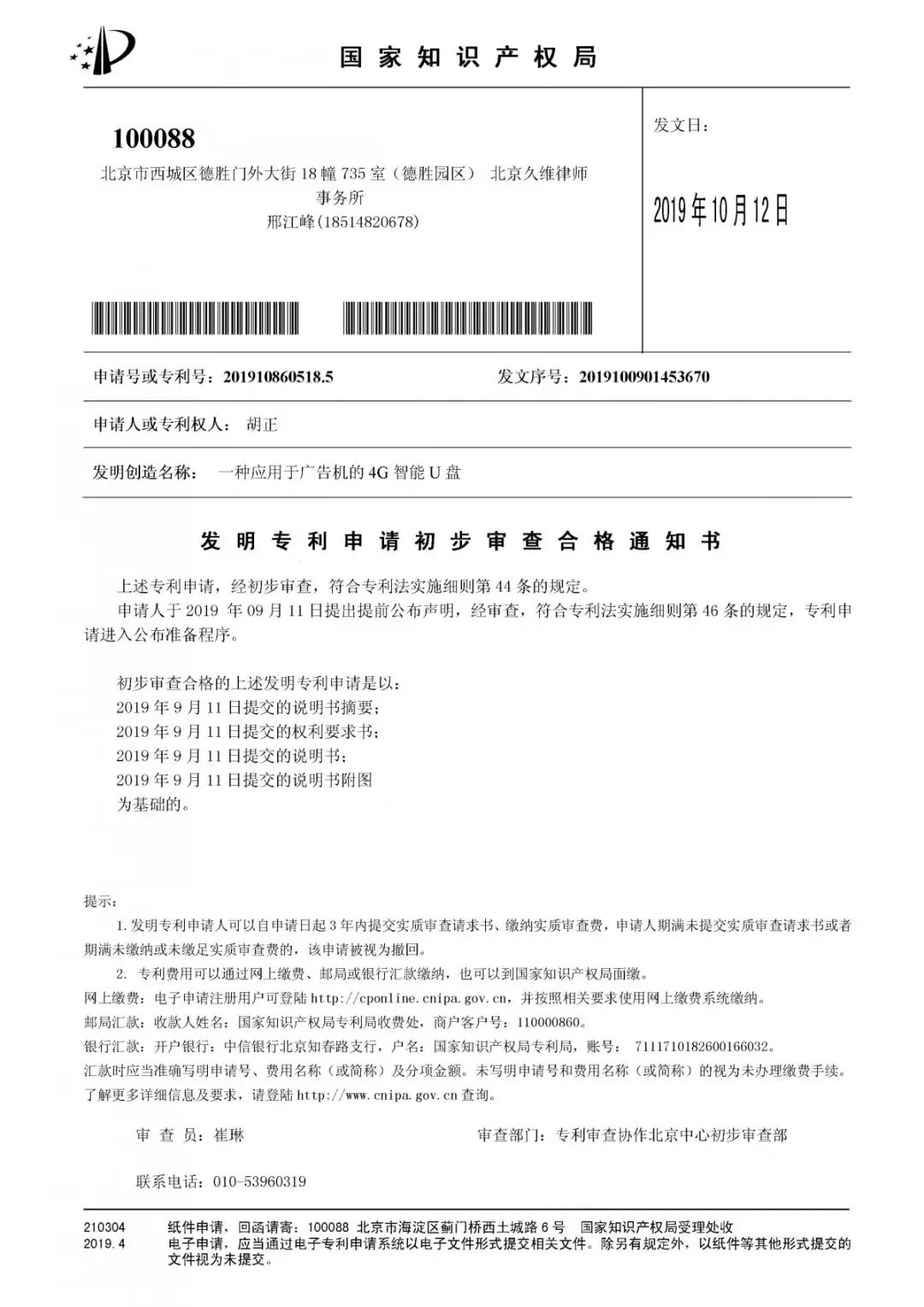 目前,KB802廣告機智能物聯網盤憑借自身明顯的優勢,已經獲得了發明專利申請初步審查合格通知書,這是對4G智能廣告機創新實力、綜合實力的肯定。